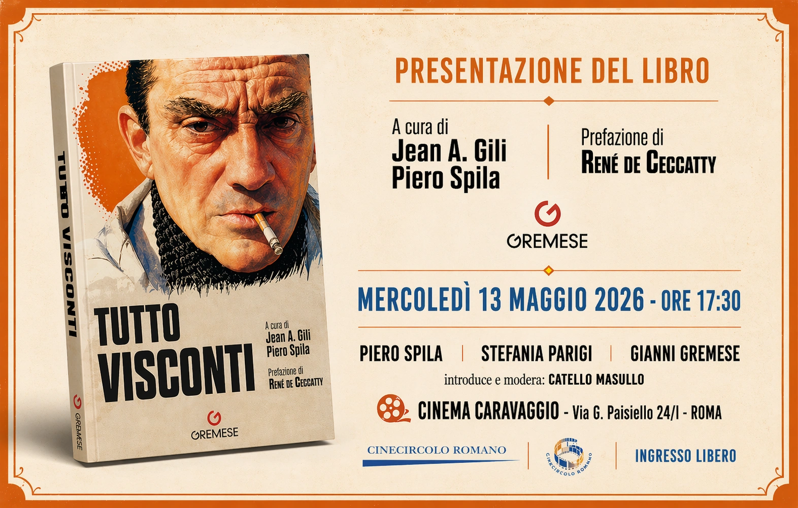 Mercoledì 13 maggio alle ore 17:30, presso il Cinema Caravaggio di Roma, si terrà la presentazione ufficiale del volume Tutto Visconti, un’opera di riferimento dedicata a uno dei più importanti protagonisti della cultura europea del Novecento. L’appuntamento è rivolto a studiosi, appassionati e a tutti coloro che desiderano approfondire la figura e l’eredità artistica di Luchino Visconti.